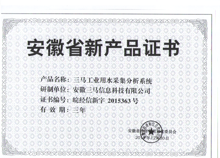 三马工业用水采集分析系统新产品证书