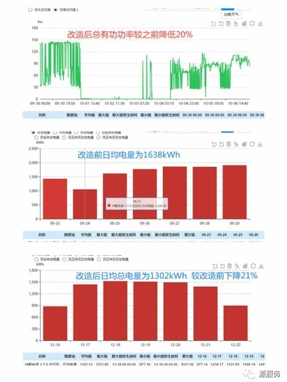 某机械制造公司,其中一台110KW的空压机设备老化严重,经试点改造后整体效率提高20%,日均总电量下降21%,节能效益一年约为7万余元。