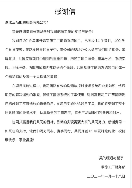 收到客户的感谢信和锦旗,是对三马科技团队兢兢业业的工作态度、专业的业务能力和服务水平、优质高效的项目效果给予的高度肯定!在此,三马科技也向广东美的暖通的配合和支持致以诚挚感谢!